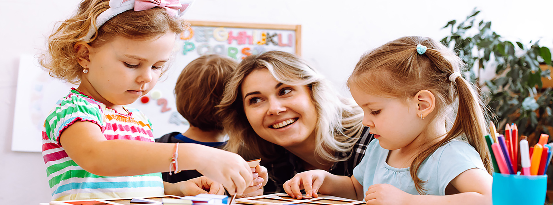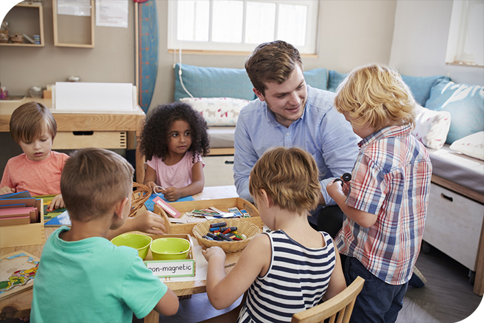 Teacher And Pupils Working At Tables In Montessori School